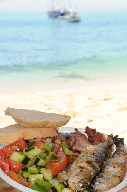fish and pork steaks, two different salads, bread, seasonal fruit, wine, juice and water. Time for